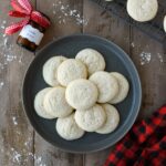 An above view of meltaway cookies on a gray plate with a bottle of vanilla extract, a cooling rack with more cookies, and a plaid towel.